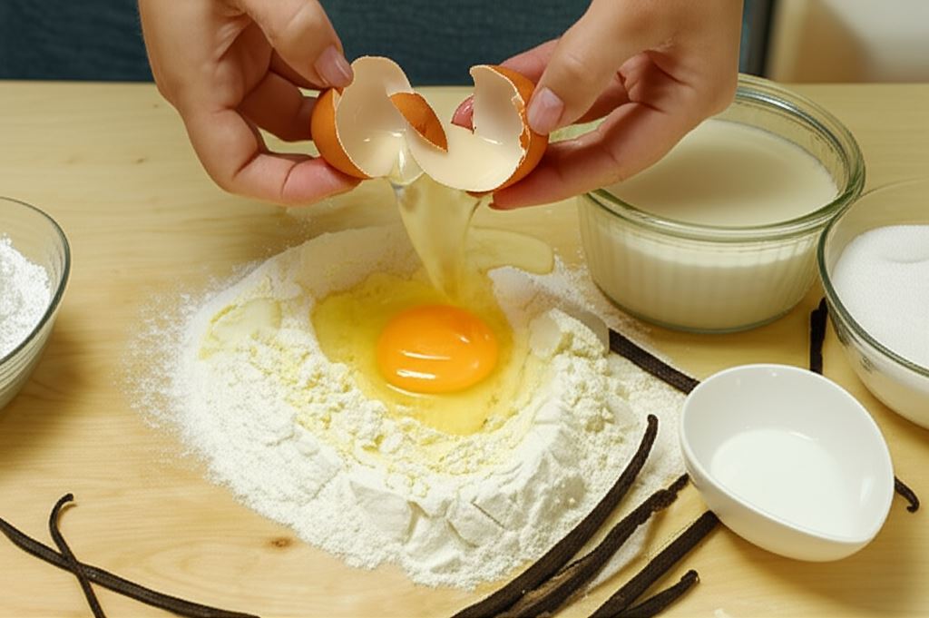 Przesiej na stolnicę mąkę jaglaną, ziemniaczaną i ryżową. Wsyp cukier puder, dodaj ziarna z przekrojonej laski wanilii, zimne masło pokrojone oraz jajko i łyżkę wody. Zagnieć szybko, aby połączyć składniki.