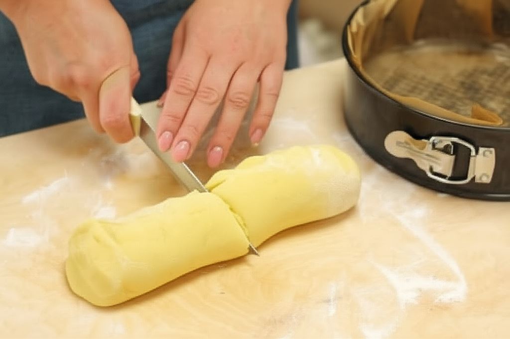 Podziel ciasto na dwie części. Jedną częścią ciasta wyłóż spód formy tortowej pokrytej papierem do pieczenia i włóż na przynajmniej pół godziny do lodówki. Drugą część ciasta umieść w zamrażarce.