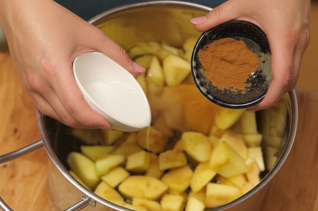 Jabłka opłucz, obierz i pokrój w kostkę. Włóż je do garnka i wraz z cynamonem, wodą i cukrem, duś do chwili, aż część jabłek się rozpadnie.