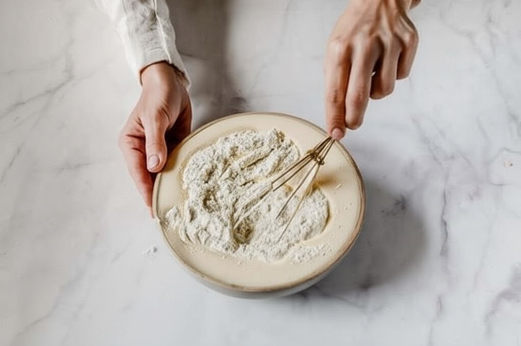 Przesiewamy mąkę razem z proszkiem do pieczenia do miski. Potem wsypujemy do masy jajecznej i mieszamy dokładnie.