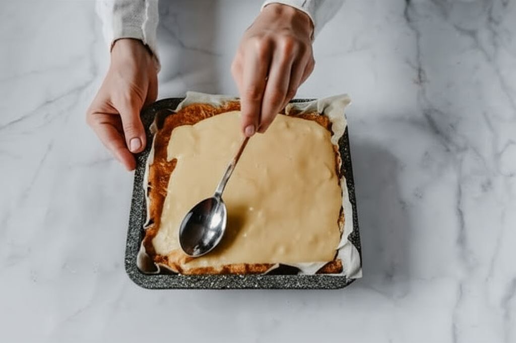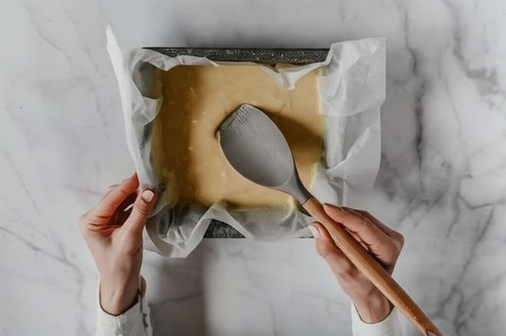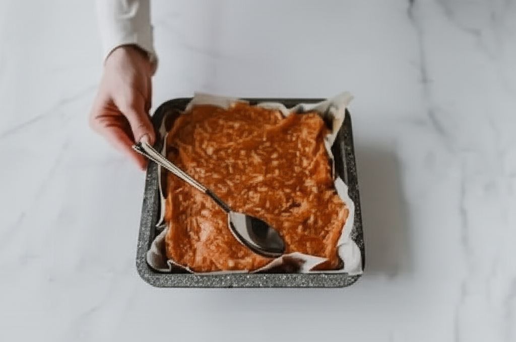 Wlewamy połowę ciasta (lub ¾) do formy wyścielonej papierem do pieczenia. Wypiekamy w piekarniku rozgrzanym do 170 °C przez około 15 minut.