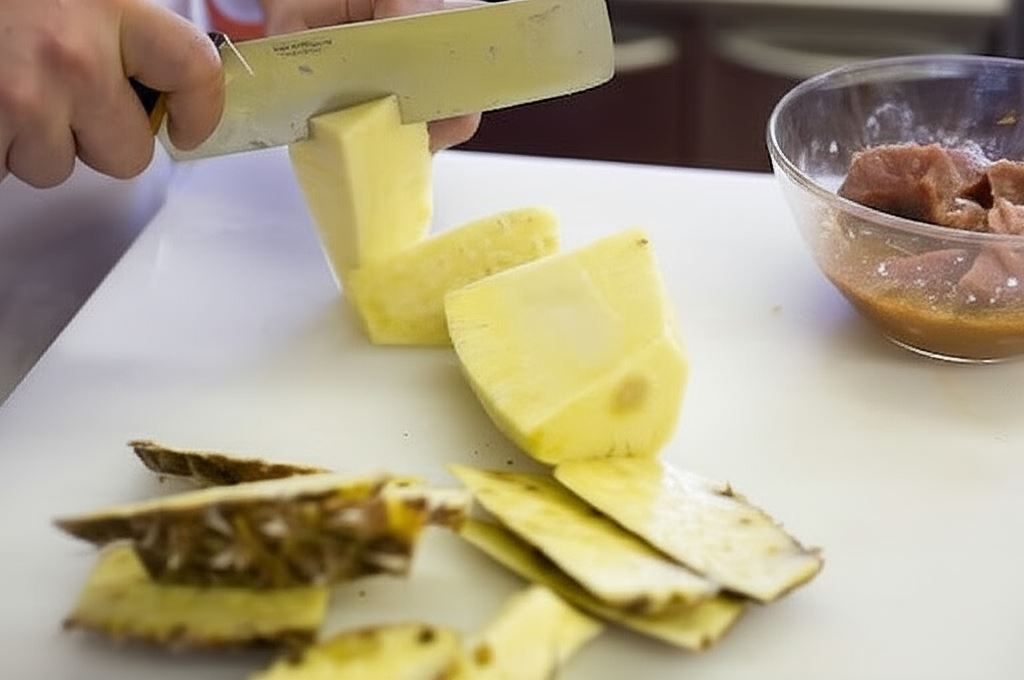 Ananasa obierz, usuń twardy rdzeń i resztę pokrój w kostkę o wielkości zbliżonej do mięsa.