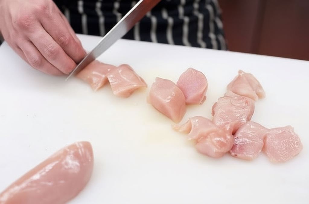 Filety z kurczaka przekrój wzdłuż na połowę, po czym każdą część podziel na cztery spore kawałki.