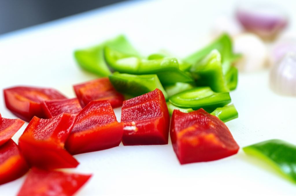 Obie papryki posiekaj w kostkę zbliżonej wielkości co kawałki kurczaka. Cebule szalotki obierz, przekrój na pół, cukinię pokrój w plastry o grubości 1 centymetra.