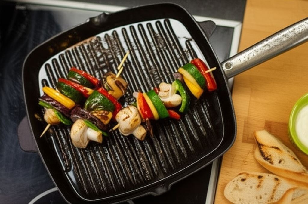 Przygotowane szaszłyki smaż przez 6-8 minut z każdej strony, aby warzywa stały się rumiane i chrupiące. Podawaj do nich jogurtowy sos z czosnkiem.