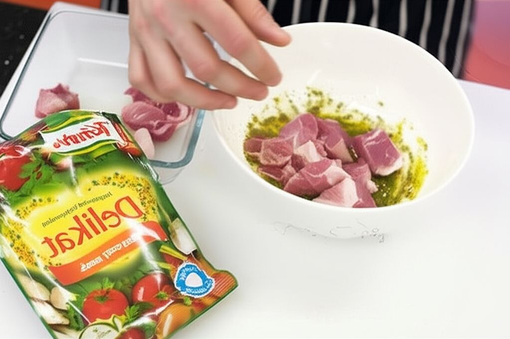 Sekret tkwi w marynacie – mieszance przyprawy Knorr, ziół prowansalskich i oleju, która nadaje mięsu głębokiego, wyrazistego smaku. Po godzinnym odpoczynku w chłodnym miejscu, mięso staje się soczyste i aromatyczne, gotowe do połączenia z warzywami na szpadkach.