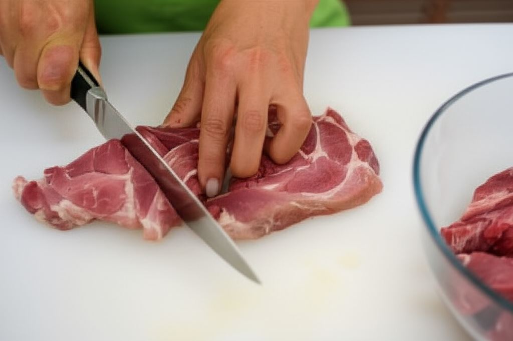 Karkówkę oczyść, opłucz i potnij na plastry o średniej grubości. Każdy plaster przetnij jeszcze na pół.