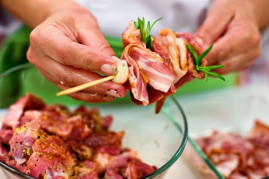 Obierz czosnek, a boczek pokrój na bardzo cienkie plastry. Na patyki do szaszłyków nabijaj kolejno: mięso, fragment rozmarynu, zrolowany boczek i czosnek. Każda porcja powinna zawierać 3-4 kawałki mięsa.