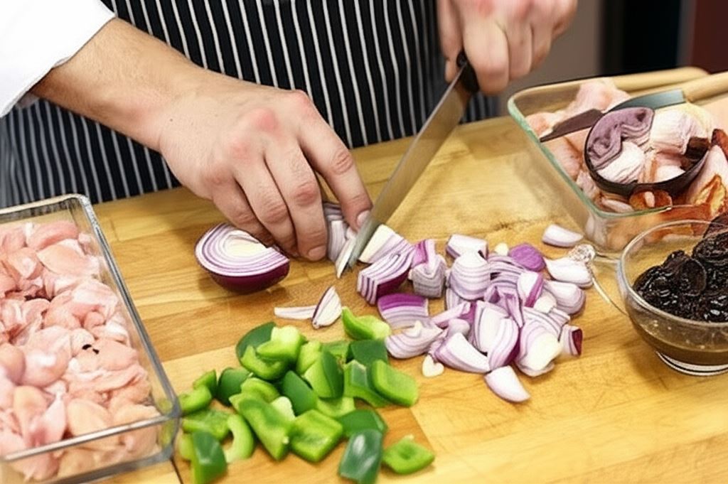 Podudzia potnij na dość duże kawałki – 3x3 cm. Boczek, cebulę i paprykę pokrój w kostkę podobnego rozmiaru, śliwki (całe) zalej brandy i odstaw na kwadrans.