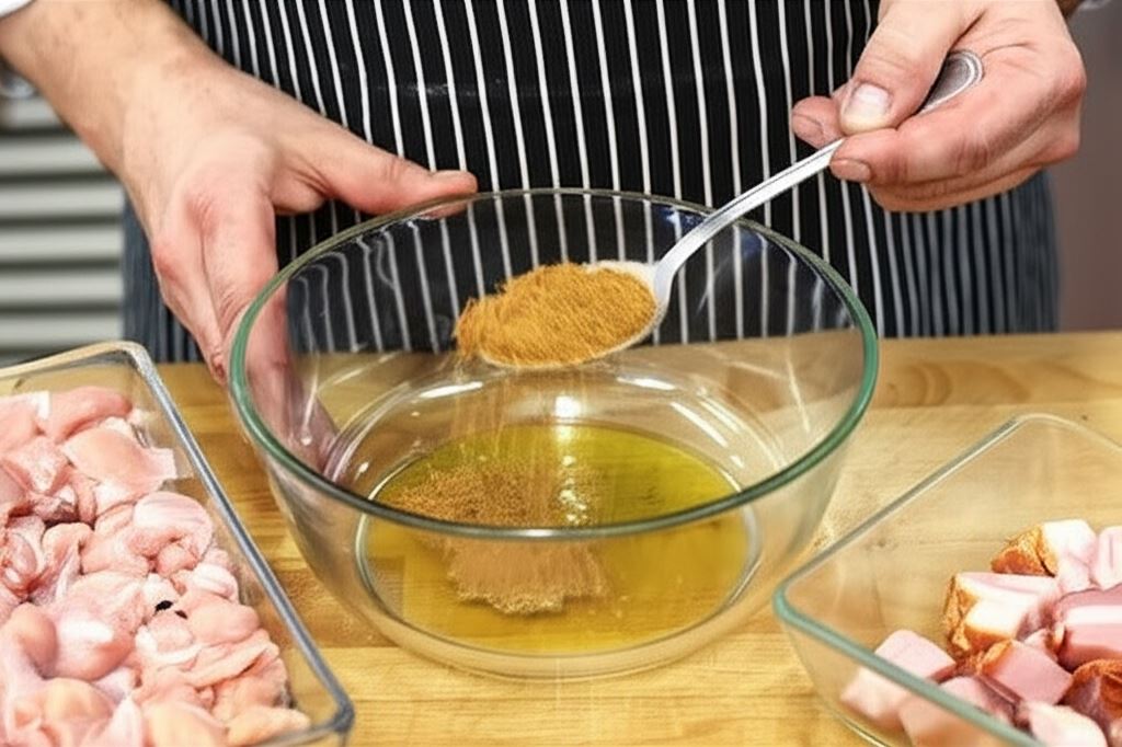 W misce połącz przyprawę Knorr z oliwą. Pokrojone mięso i boczek umieść w misce i wymieszaj z przyprawą. Odstaw również na 15 minut.