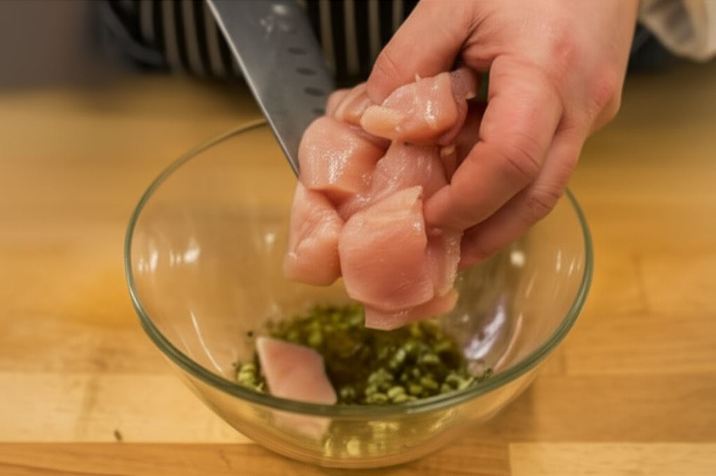 Pierś kurczaka opłucz, starannie osusz. Mięso potnij w grubą kostkę. Przygotuj marynatę: czosnek przepuść przez praskę, wsyp oliwę z oliwek i suszony lubczyk. Mięso połącz z marynatą i odstaw do lodówki na około 30 minut.
