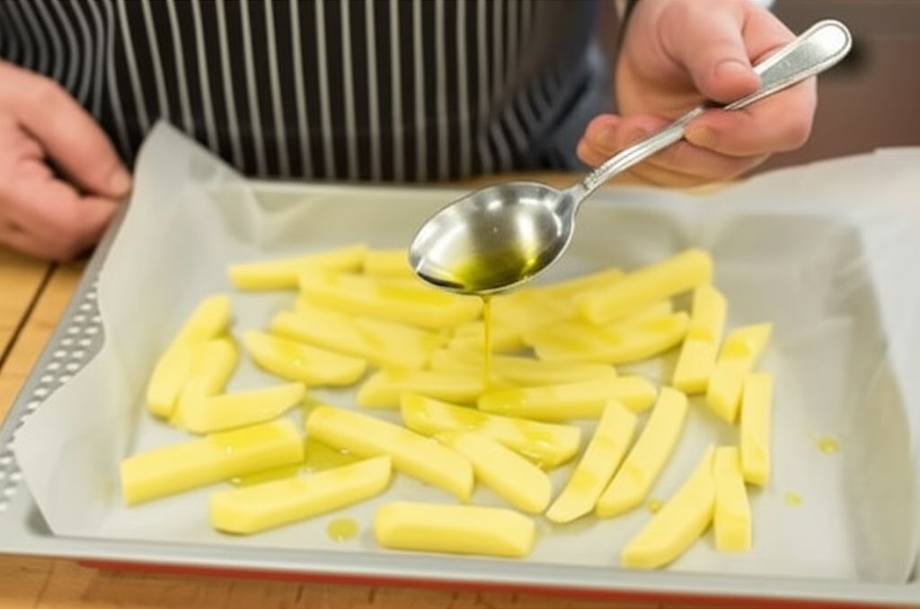 Ziemniaki obierz i potnij w plastry, a potem w słupki (grubość frytek zależy od upodobań). Pocięte ziemniaki przenieś do miski z zimną wodą i starannie opłucz ze skrobi, potem osusz i połącz z oliwą z oliwek. Przygotowane ziemniaki rozłóż na blasze z pergaminem i piecz w piekarniku rozgrzanym do 200 °C przez około 20 minut do zrumienienia. W połowie pieczenia zamieszaj frytki, aby równomiernie się przypiekły z obu stron.