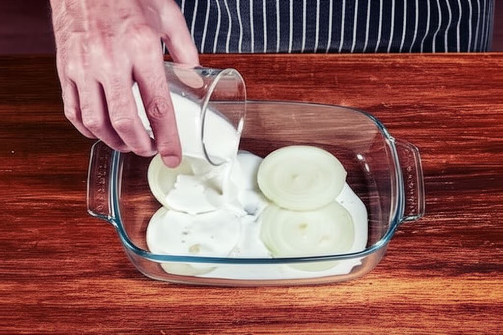 Z cebuli wytnij 4 krążki, zalej mlekiem, odłóż w chłodne miejsce.