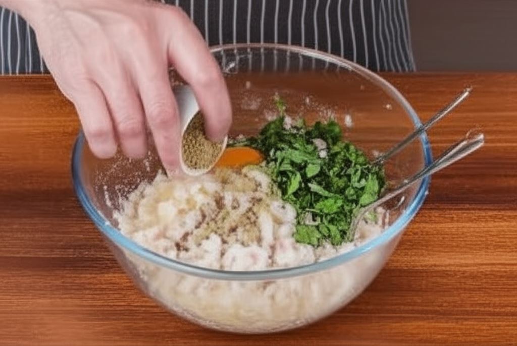 Dodaj do masy jajko, 4-5 łyżek bułki tartej, posiekaną zieleninę i przyprawy. Wymieszaj dokładnie i rozdziel na 4 jednakowe porcje.