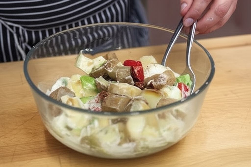 Możesz eksperymentować z tą sałatką, zamieniając zwykłe ziemniaki na pieczone bataty. Nadadzą one potrawie delikatnie słodkawego smaku, który znakomicie komponuje się z pozostałymi składnikami i wnosi nowy wymiar do tego prostego, ale wyrazistego dania.