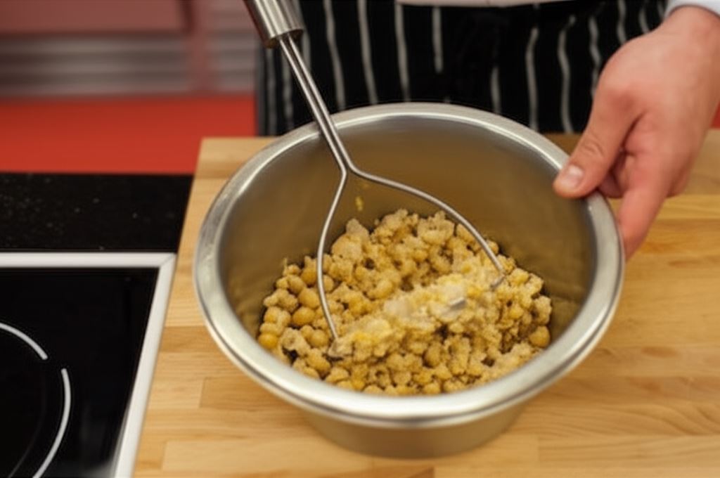 Ciecierzycę odcedź z zalewy i umieść w misce. Potem rozgnieć tłuczkiem do przygotowania purée.