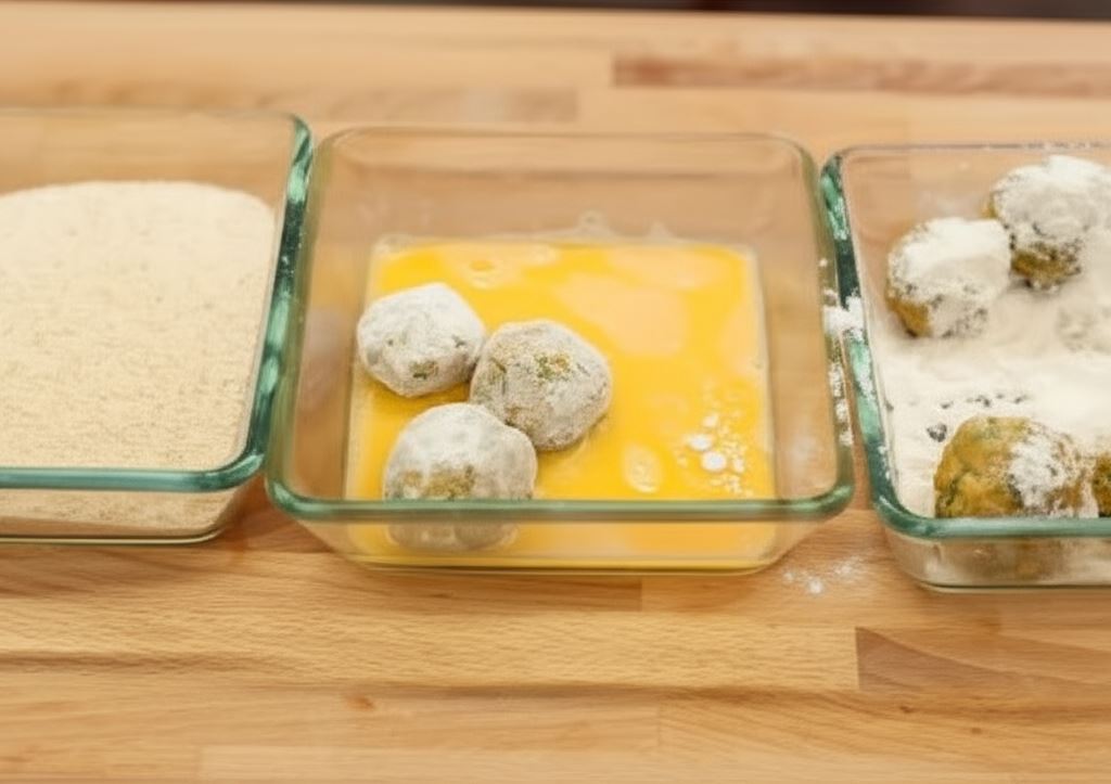 Uformuj w rękach niewielkie kuleczki z ciecierzycy i obtaczaj je po kolei w mące, roztrzepanym jajku i bułce tartej.