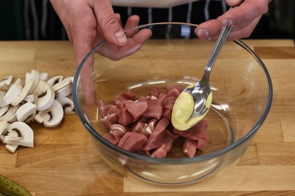 Mięso potnij w cienkie paski. Dodaj musztardę i starannie wymieszaj. Odstaw na moment, by się zamarynowało. Pieczarki pokrój na kawałki.