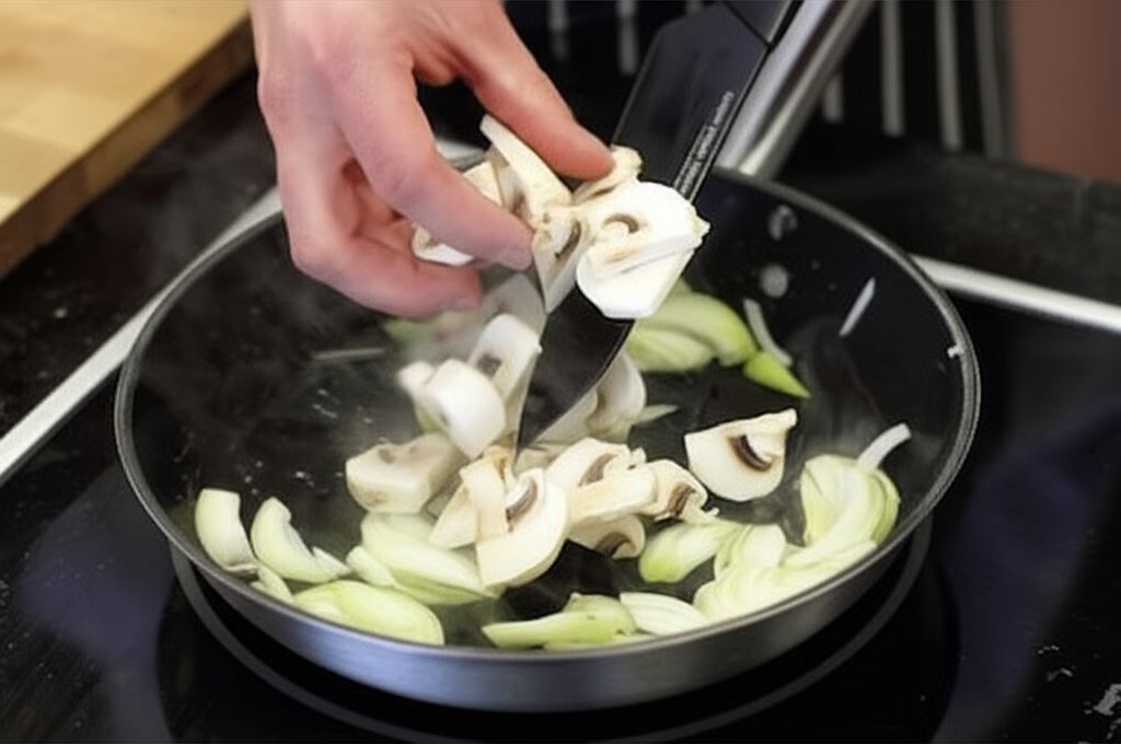 Rozgrzej dobrze olej na patelni i zrumień pokrojoną w piórka cebulę oraz pieczarki.