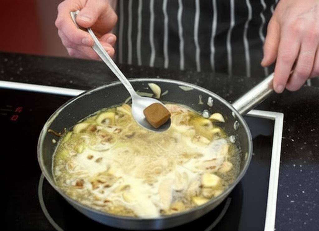 Wlej 300 ml wody i wsyp Sos do pieczeni z grzybami Knorr. Duś całość, aż potrawa nieznacznie zgęstnieje.