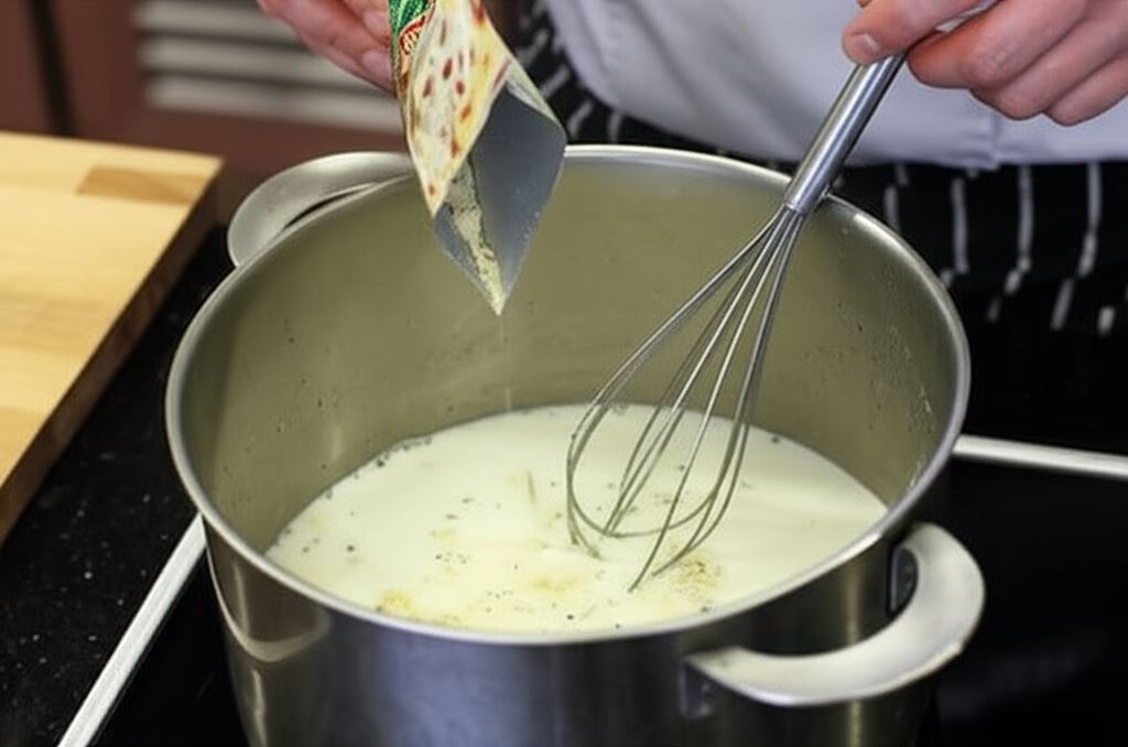 Zawartość paczki Knorr połącz w małym garnku ze 150 ml wody oraz śmietaną i doprowadź do wrzenia. Zredukuj ogień i gotuj przez 5 minut.