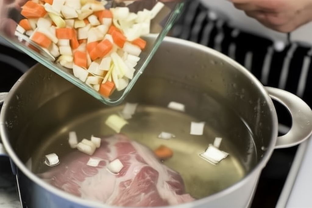 Po tym czasie zalej szynkę ponownie zimną, świeżą wodą. Dodaj pokrojoną włoszczyznę oraz sól i doprowadź do wrzenia.