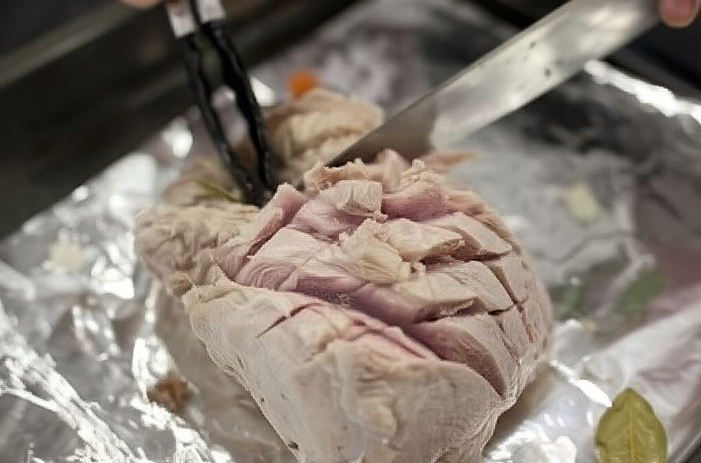 Potem wyjmij mięso i umieść w brytfance do pieczenia. Górną część szynki ponacinaj na krzyż w odstępach 1-centymetrowych. Wywar możesz zatrzymać do przygotowania zupy.