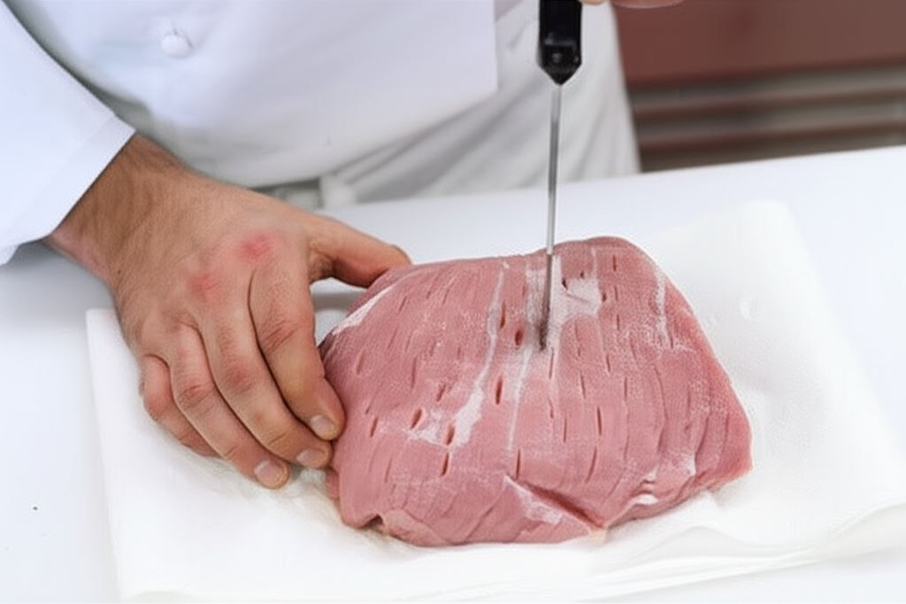 Szynkę opłucz i wysusz, a następnie przy użyciu wąskiego noża lub szpikulca gęsto podziuraw całą wierzchnią powierzchnię mięsa.