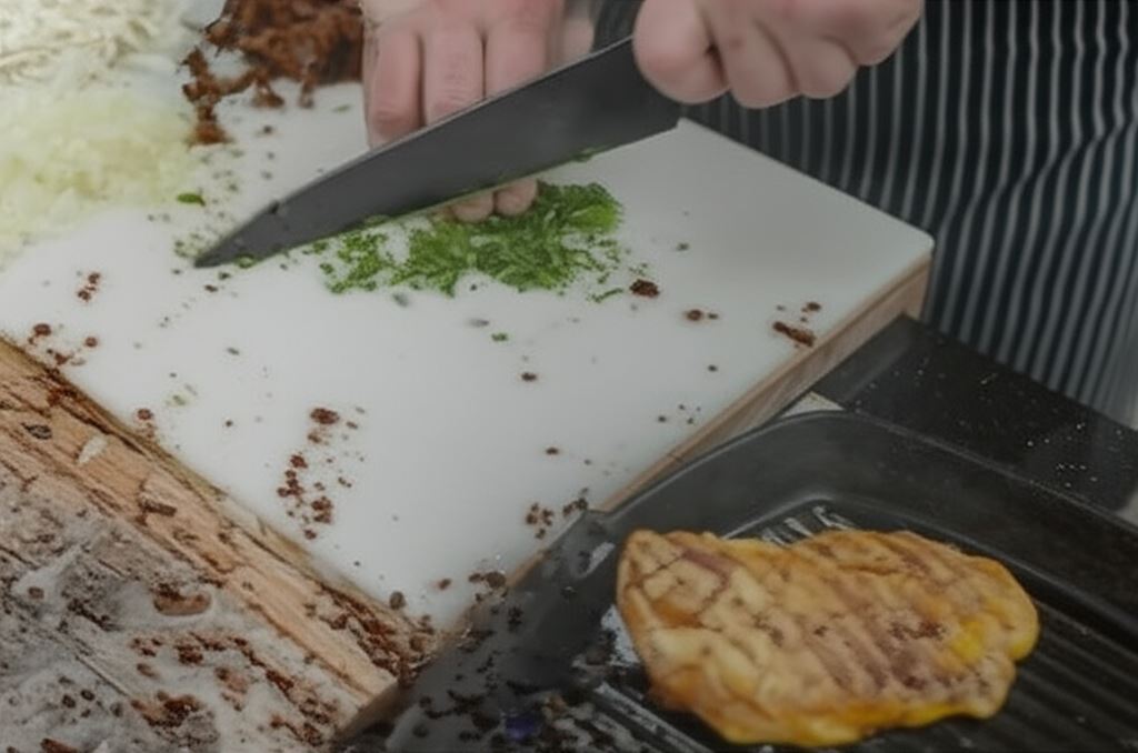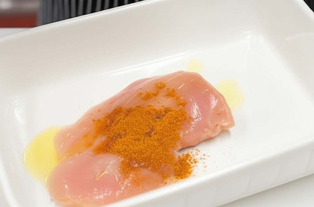 Pierś kurczaka osusz ręcznikiem papierowym, skrop oliwą i przypraw przyprawą do kurczaka. Następnie zrumień na patelni grillowej po obu stronach.