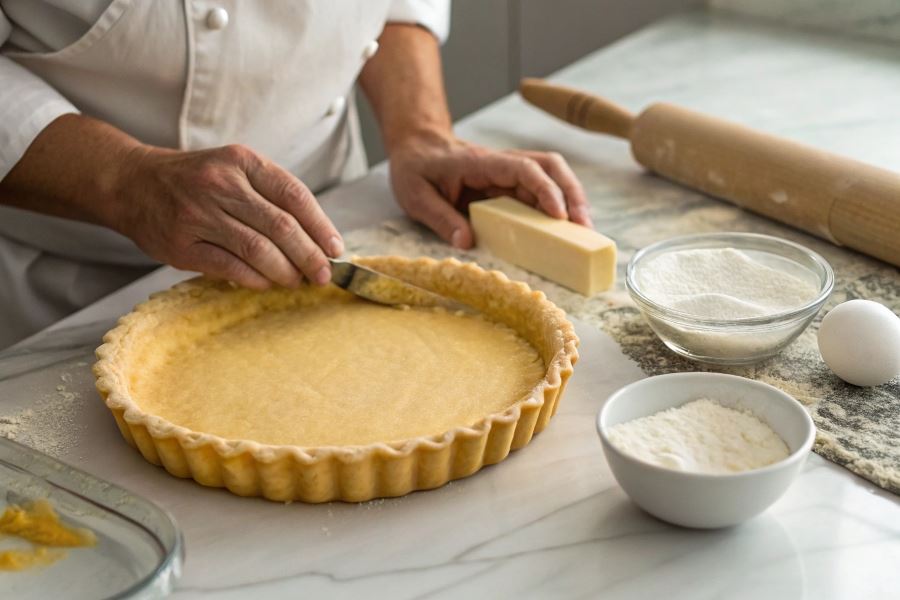 Ciasto na tartę przygotowane dzień wcześniej jest łatwiejsze w obróbce, mniej się klei do wałka i zachowuje stabilność podczas przenoszenia do formy.