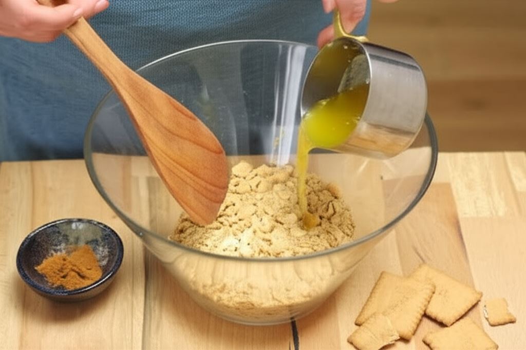 Okrągłą formę posmaruj masłem. Herbatniki umieść w malakserze i rozdrobnij. W rondelku roztop masło i dodaj wraz z cynamonem do kruszonki. Wymieszaj.