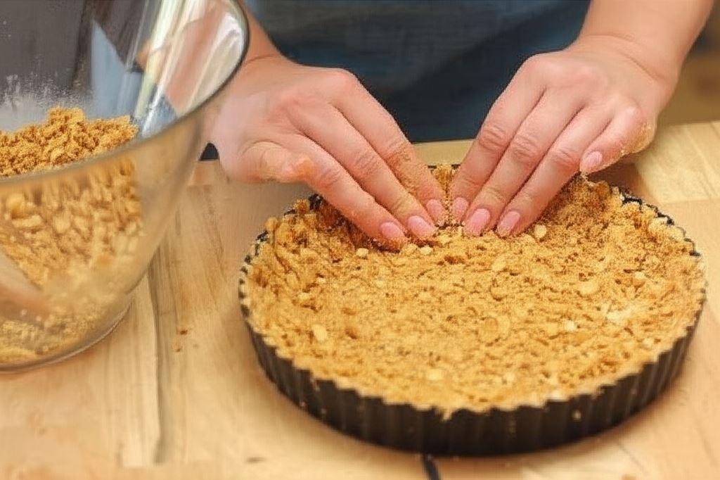 Spód i brzegi formy wyłóż przygotowaną kruszonką z herbatników. Umieść w piekarniku rozgrzanym do 180°C i piecz przez 10 minut. Wyjmij i ostudź.