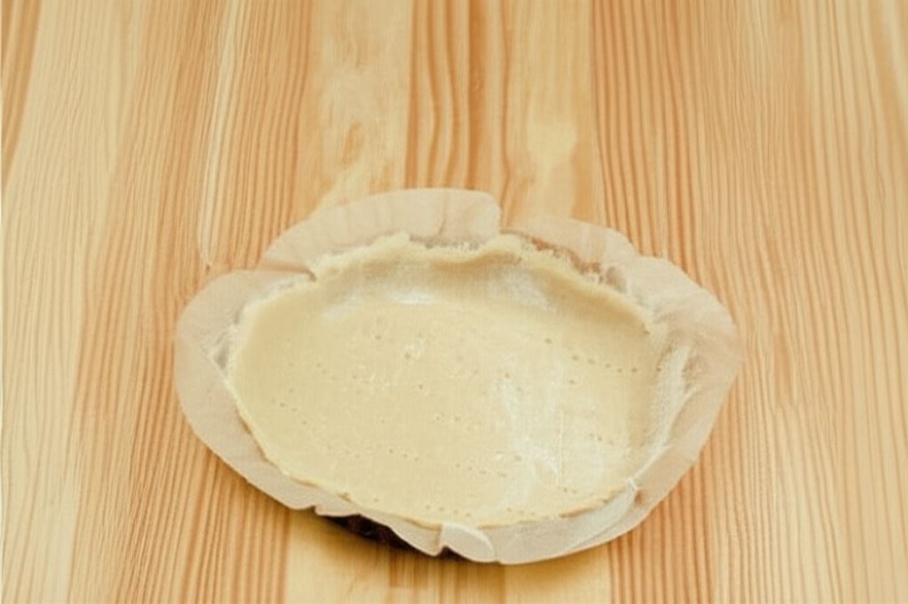 Ochłodzone ciasto rozwałkuj cienko, wyłóż na formę do tarty o średnicy około 24 cm, nakłuj widelcem i wypiekaj w temperaturze 170 stopni przez około 10-15 minut aż stanie się kruche i złociste.