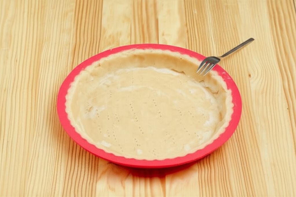 Ochłodzone ciasto rozwałkuj cienko, wyłóż na formę do tarty o średnicy około 30 cm, nakłuj widelcem i wypiekaj w temperaturze 170 stopni C przez około 10-15 minut aż stanie się kruche i złociste.