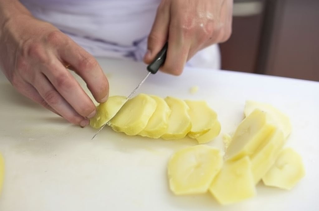 Ziemniaki ugotuj w mundurkach, ostudź, obierz, a potem pokrój w plasterki.