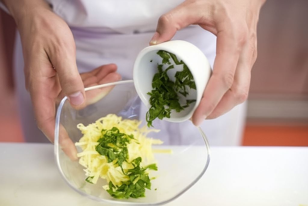 Żółty ser zetrzyj na tarce z dużymi oczkami, natkę drobno posiekaj i połącz z serem.