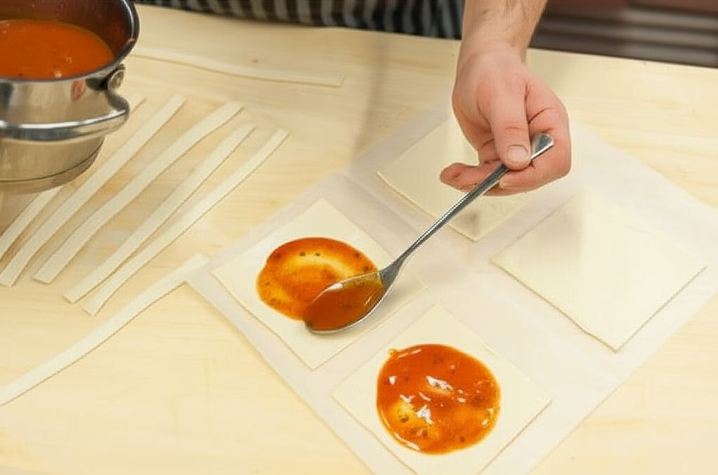 Arkusze rozmrożonego ciasta francuskiego rozwałkuj lekko i potnij na kwadraty o wymiarze ok. 8x8cm. Spód ciasta posmaruj sosem pomidorowym. Na krawędź ciasta przyklej półcentymetrowy pasek wycięty z pozostałego ciasta.