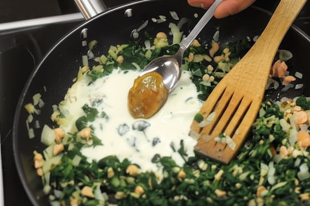 Łososia i cebulę pokrój w kostkę i podsmaż w garnku na oliwie. Dodaj szpinak i smaż razem przez moment.