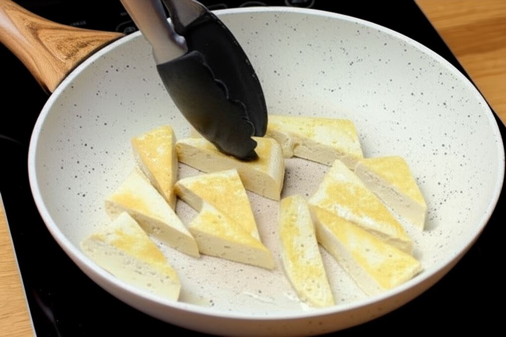 Tofu wyjmij z opakowania, odcedź na sitku i potnij w kostkę o wymiarach około 2 × 2 cm. Przełóż do miseczki, skrop oliwą, lekko wymieszaj tak, by tłuszcz dokładnie pokrył wszystkie powierzchnie, a potem podsmaż na patelni równomiernie ze wszystkich stron.
