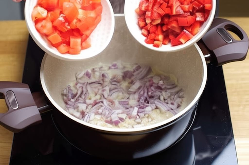 Przygotuj wszystkie warzywa wymienione w przepisie. Pomidory i paprykę starannie umyj, osusz, a potem pokrój w kostkę. Cebulę i czosnek obierz ze skórki i drobno posiekaj. Całość podsmaż w garnku na porządnie rozgrzanym maśle.