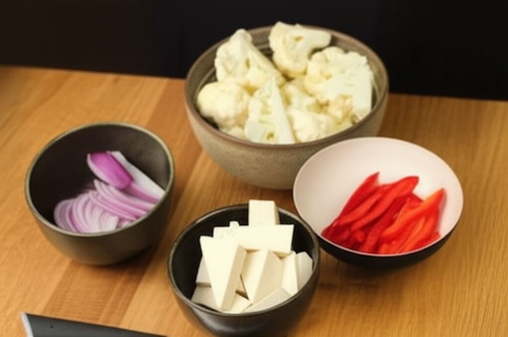 Cebulę posiekaj w piórka, paprykę w słupki, tofu w trójkąty, kalafior podziel na mniejsze kawałki.