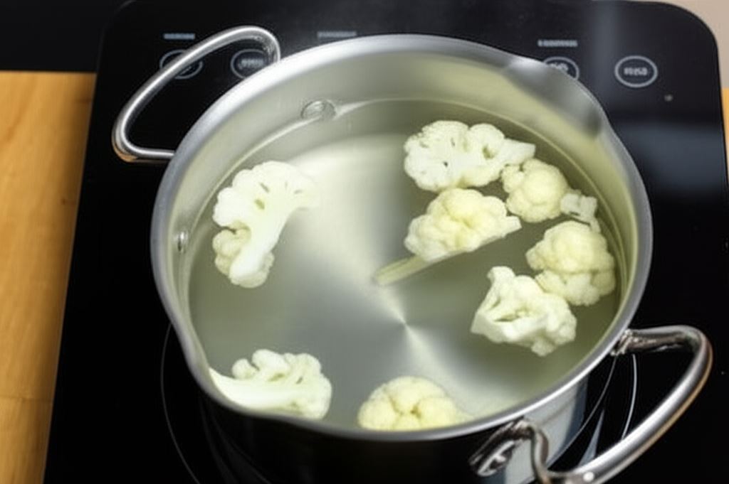 W garnku doprowadź wodę do wrzenia, wsyp sól, cukier i kalafior. Gotuj przez 5 min po czym odcedź.
