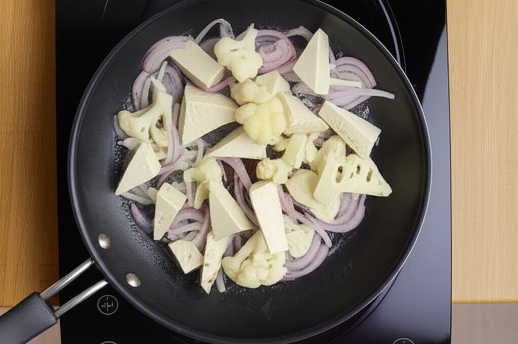 Cebulę zrumień na patelni używając oleju, potem wsyp paprykę, tofu i kalafiora. Wszystko smaż przez ok. 4 min.