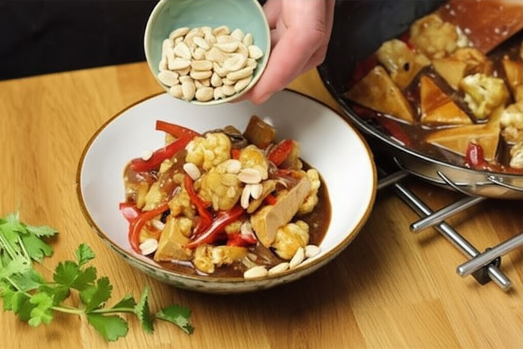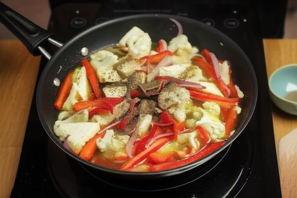Delikatne tofu w towarzystwie słodkiej papryki i aromatycznego czarnego pieprzu to propozycja, która zachwyci nawet najbardziej wymagających smakoszy. To danie, w którym prostota składników spotyka się z głębią smaków Dalekiego Wschodu. Soczyste kawałki tofu, chrupiąca papryka i delikatny kalafior tworzą harmonijną kompozycję, która jest zarówno pożywna, jak i lekka.