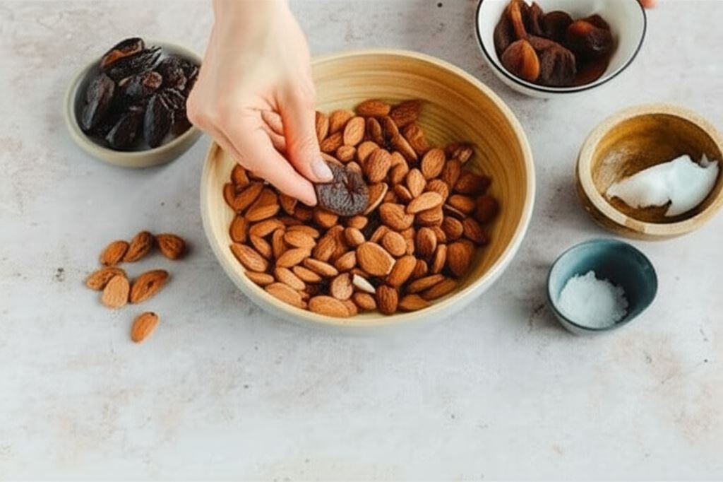 Morele i daktyle moczymy w ciepłej wodzie przez ok. 15 min. Migdały wsypujemy do miski. Dodajemy odcedzone morele i daktyle. Wsypujemy olej kokosowy oraz sól. Wszystko miksujemy na jednolitą masę.