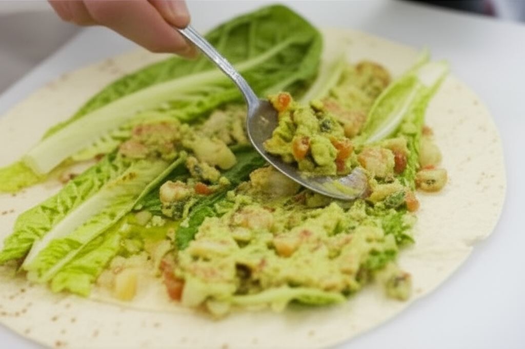 Tortille posmaruj cienką warstwą pasty. Potem ułóż liście sałaty i znów posmaruj warstwą awokado.