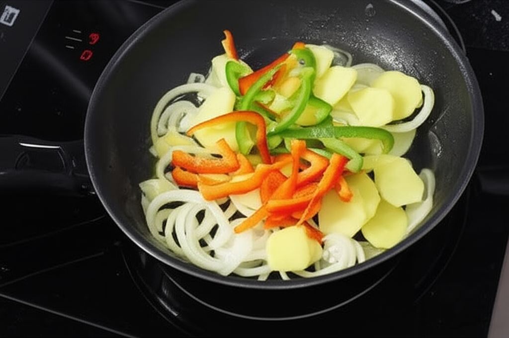 Ziemniaki obierz i potnij w cienkie plastry. Dużą cebulę pokrój w krążki. Oczyszczone papryki poszatkuj na cienkie paski.