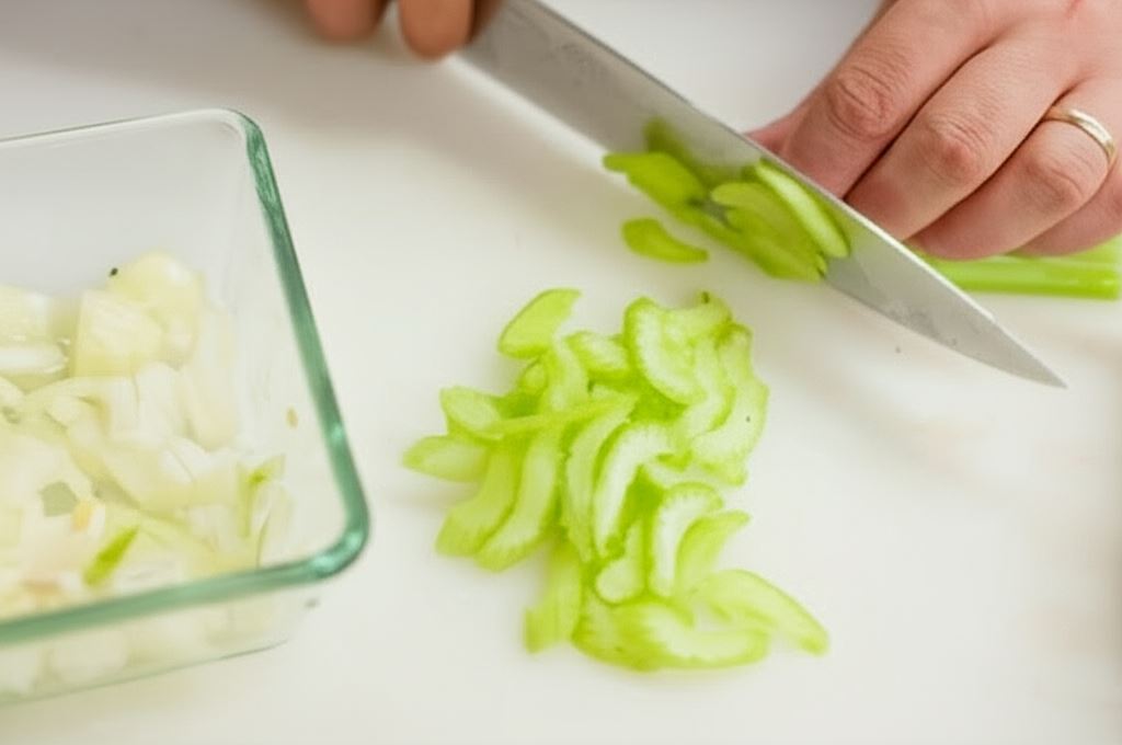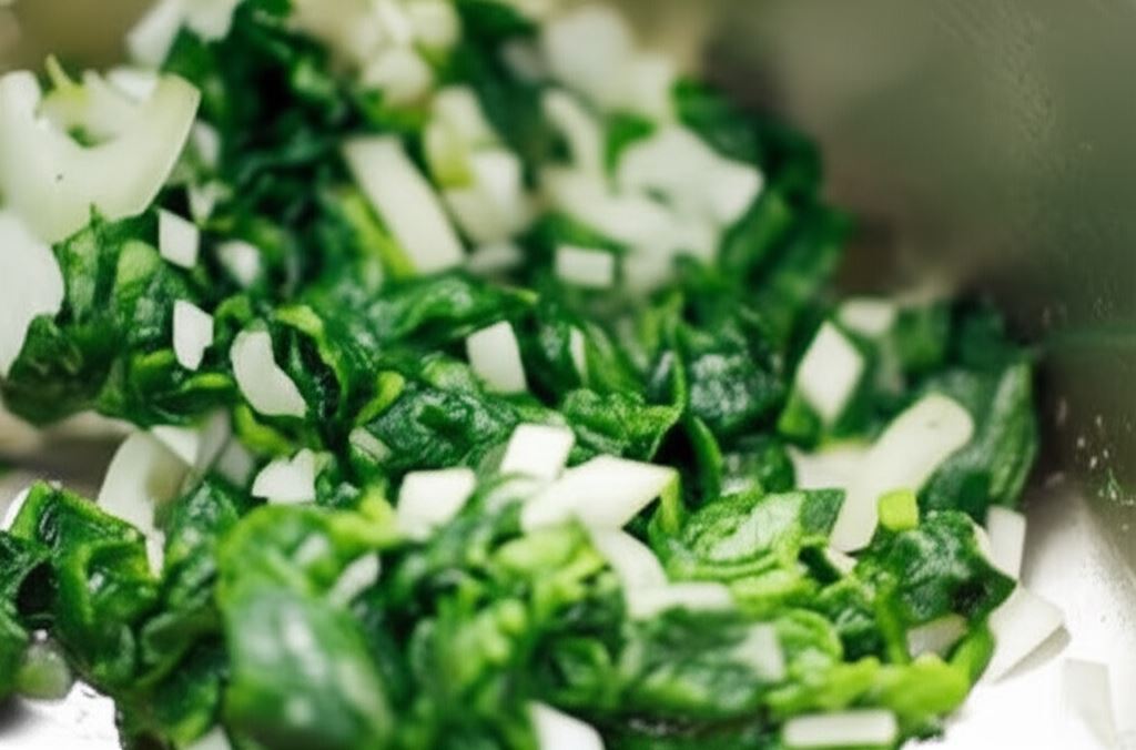 Posiekaj szpinak, cebulę, czosnek i seler.