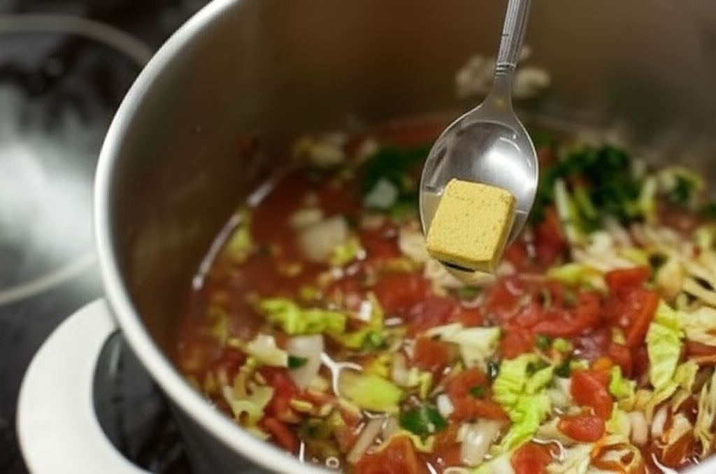 Smaż, aż cebula zmięknie. Wsyp seler, nieodsączone i zmiażdżone pomidory, kapustę, tymianek, bulion Knorr oraz wodę.