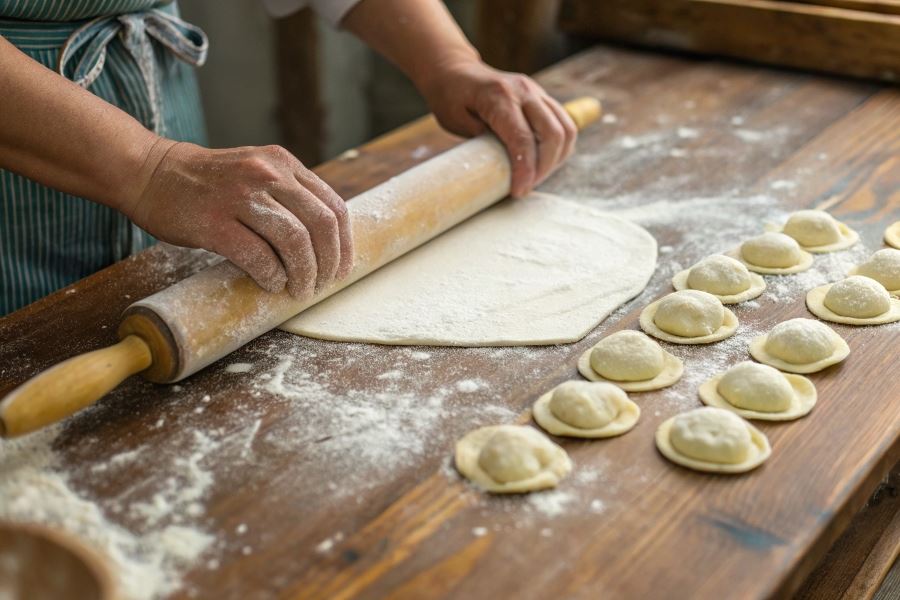 Tradycyjne ciasto na pielmieni powinno być rozwałkowane bardzo cienko – niemal do przezroczystości, co wymaga odpowiedniej elastyczności i wytrzymałości.